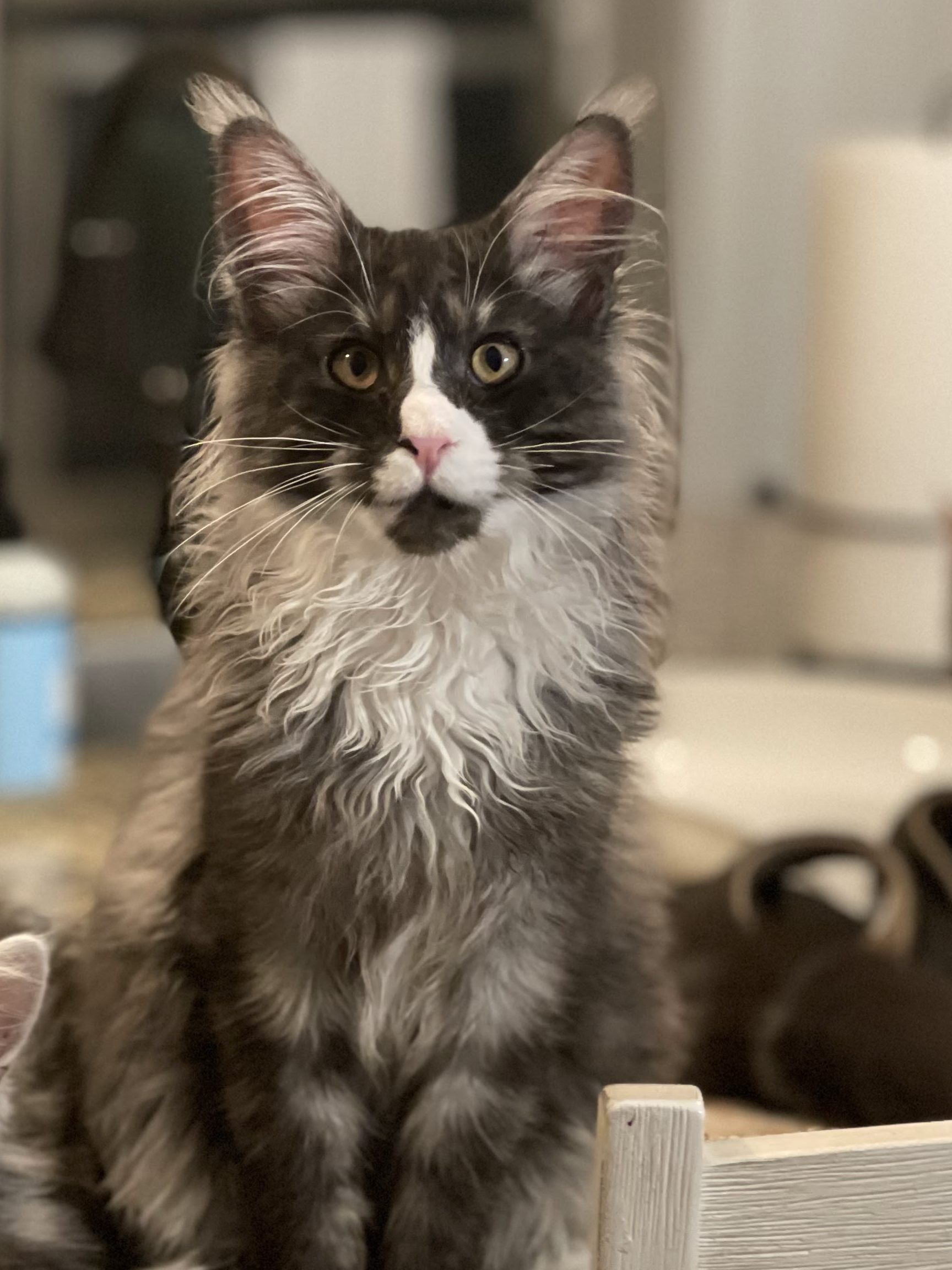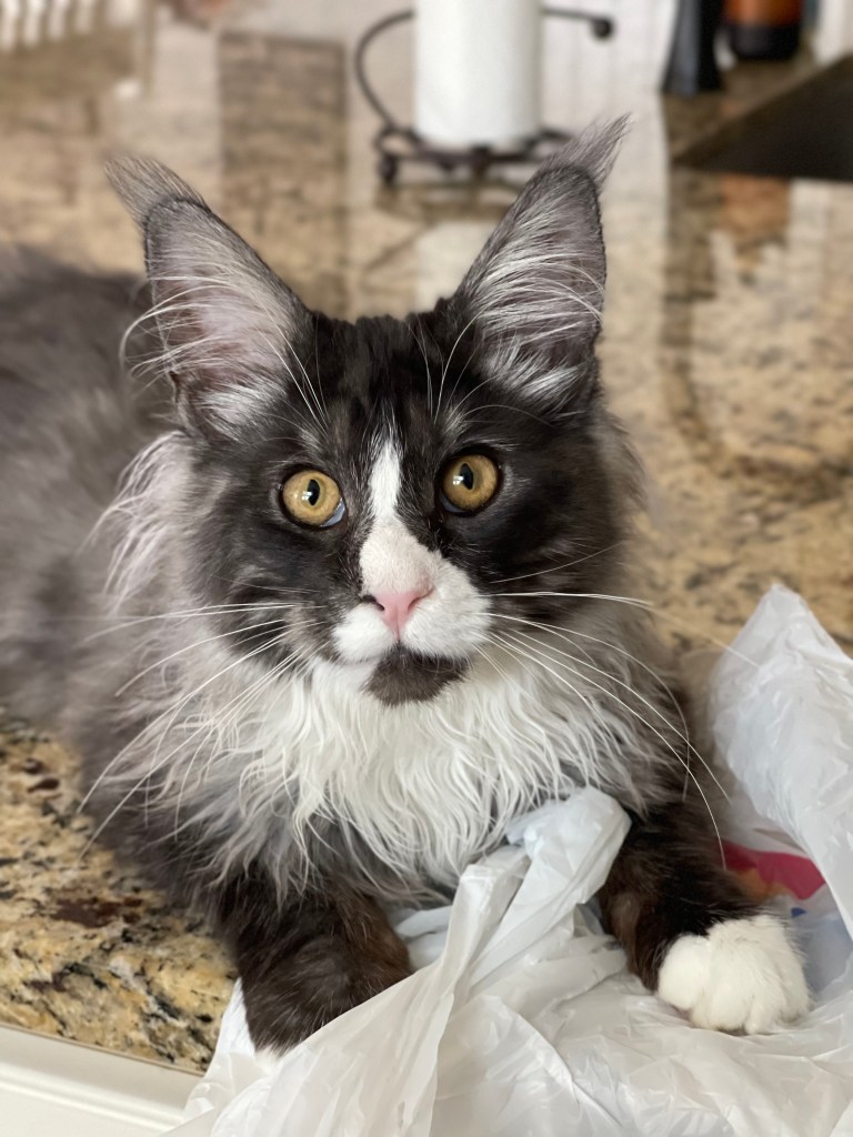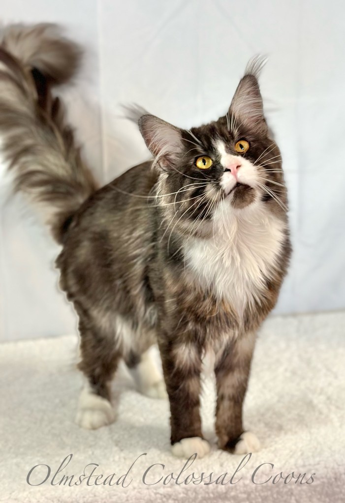 Black smoke with white. Very loving boy who wants to lay on you and loves head scratches.